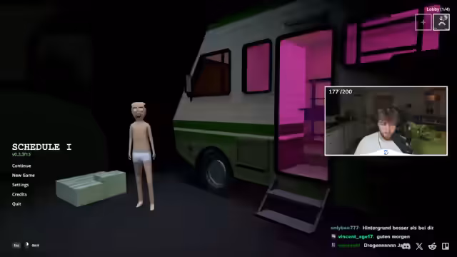00:00:44Der Streamer kündigt an, im Keller seiner Oma Drogen anzubauen und im Casino zu grinden. Er plant, mit 8.000 Bargeld ins Casino zu gehen und bis 2 Uhr zu zocken. Er ist süchtig nach Schedule 1 und lädt Mertix, seinen "kleinen Türken", ein, beim Drogenanbau zu helfen. Es werden zwei weitere Mitspieler erwartet, die das Spiel professionell beherrschen. Ziel ist es, heute 100.000 im Trockenbusiness zu machen. Er fragt im Chat nach, wer bei ihm im Real Life Drogen kaufen würde und kündigt an, morgen früh Lieferungen auszufahren, wofür er noch Unterstützung benötigt. Bis seine Kumpels da sind, will er ins Casino gehen und fragt den Chat, ob er mit 1.000 ins Casino gehen soll. Er erwähnt, dass er 8.000 auf der Bank hat und es sich leisten kann, kurz Casino zu spielen.