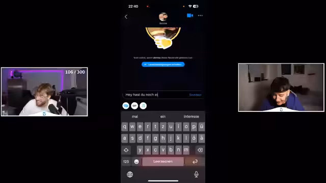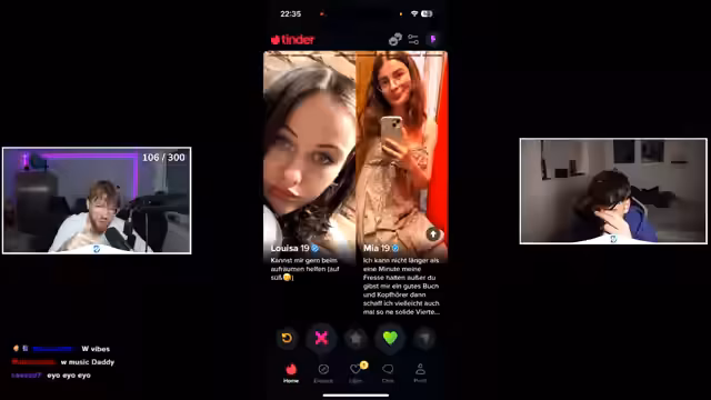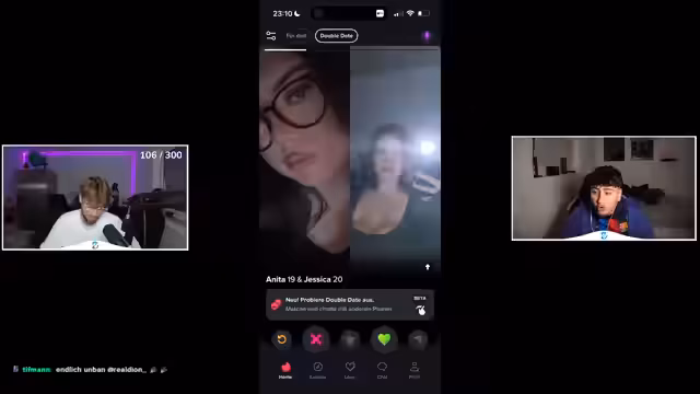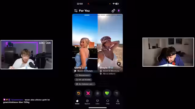 00:40:05Die Streamer beginnen, Profile auf Tinder zu bewerten und zu liken. Sie stoßen auf verschiedene Duos, darunter zwei Asiatinnen und ein Paar, das einen flotten Dreier zu suchen scheint. Es wird darüber spekuliert, ob Alex die Situation als Vorwand nutzt, um selbst Frauen auf Tinder zu suchen. Sie diskutieren Profile, die nach Freundschaft suchen, und wundern sich über die Motivation dahinter. Der Streamer erhöht den Umkreis auf 160 Kilometer, um mehr potenzielle Matches zu finden. Sie stoßen auf ein Profil, das eine Freundschaft sucht und eine Einladung zu einem Date ausspricht, jedoch mit der Bedingung, dass ein Kumpel und eine Freundin mitkommen müssen.