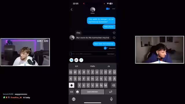 00:53:02Alex Dimakos und der Streamer diskutieren über ein Tinder-Match, das nur 20 Kilometer entfernt ist und sich noch am selben Abend treffen möchte. Der Streamer zeigt sich unsicher und unerfahren im Umgang mit solchen Situationen, während Alex ihn drängt, auf die Anfrage einzugehen. Es entsteht eine humorvolle Debatte darüber, ob das Match Alex' Typ ist und wie er auf die Nachricht reagieren soll. Die Unsicherheit des Streamers, wie man sich mit Frauen trifft, wird thematisiert, und Alex versucht, ihn zu überzeugen, das Treffen zu arrangieren. Die Situation wird durch die Kommentare im Chat zusätzlich angeheizt, die sich ebenfalls an der Diskussion beteiligen und Ratschläge geben.
