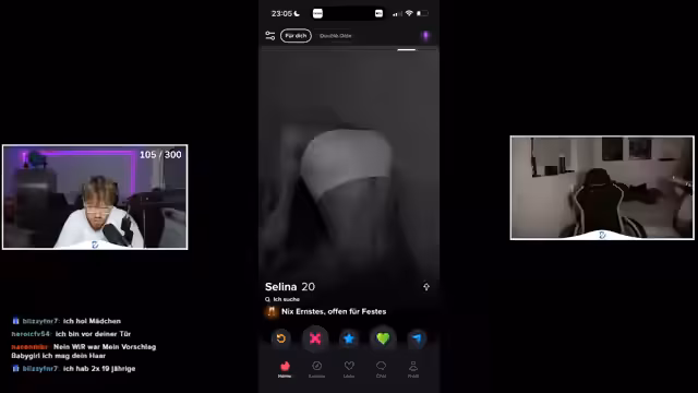 00:57:03Der Streamer und sein Freund scannen die angezeigten Profile auf Tinder. Sie diskutieren die Typen der Frauen, die ihnen gefallen und wie man am effektivsten mit ihnen interagieren kann. Dabei werden auch Profile besprochen, die nicht dem eigenen Typ entsprechen. Das Ziel ist es, herauszufinden, welche Strategie am besten funktioniert, um auf Matches zu kommen und erfolgreiche Dates zu vereinbaren.