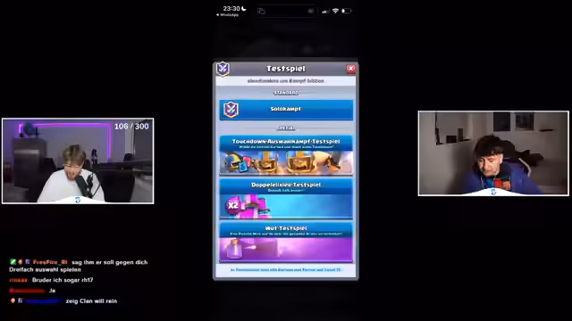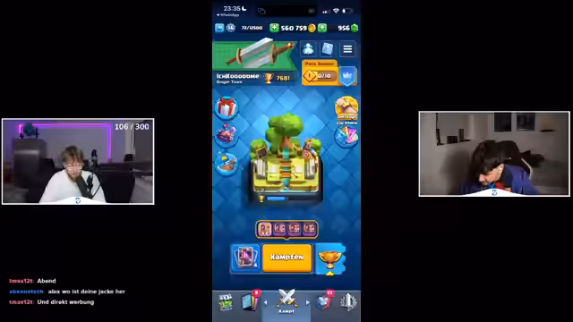 01:16:52Nach den Schwierigkeiten auf Tinder schlägt der Streamer vor, Clash of Clans zu spielen, da er das Spiel seit seiner Kindheit kennt und es für ihn eine willkommene Abwechslung wäre. Es kommt zu einer spontanen Clash Royale Herausforderung zwischen dem Streamer und Alex, bei der um 1000 Euro gespielt werden soll. Die Spieler diskutieren über ihre Decks und Spielstrategien, wobei der Streamer zugibt, lange nicht mehr aktiv gespielt zu haben. Die Matches sind von humorvollen Kommentaren und gegenseitigen Sticheleien geprägt, während sie versuchen, sich an die Mechaniken des Spiels zu erinnern und ihre Gegner zu besiegen. Die Diskussion über die Spielmodi und die Auswahl der Karten sorgt für zusätzliche Unterhaltung und Spannung.