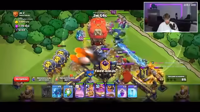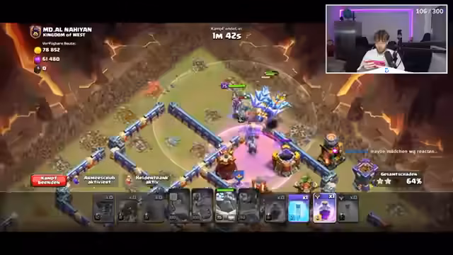 01:36:07Das Spiel wird abrupt beendet, und der Streamer wechselt zu Clash of Clans. Er gibt an, den Account seit 13 Jahren zu besitzen und nun aktiv zu spielen. Im Clan-Krieg greift er die Basis eines Gegners an. Nach anfänglichen Schwierigkeiten und einem fehlerhaften Angriff gelingt es ihm, mit einem zweiten Angriff die Basis erfolgreich zu übernehmen und zwei Sterne zu erzielen.