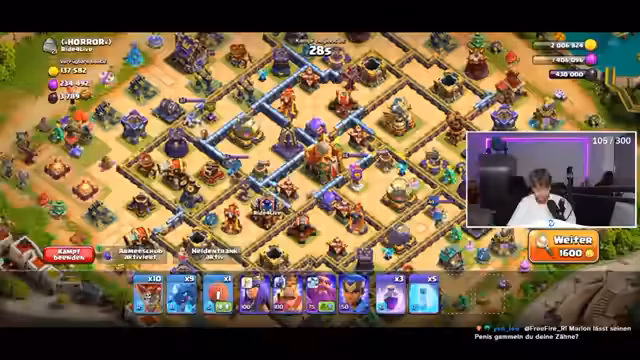 01:35:27Der Streamer wechselt zu Clash of Clans und beginnt, seine Basis zu optimieren und Mauern zu verbessern. Er erklärt, dass er das Spiel seit seiner Kindheit spielt, aber lange Zeit inaktiv war. Die Zuschauer im Chat beteiligen sich an der Diskussion über Clash of Clans und geben Ratschläge zum Basisbau und zu Strategien. Der Streamer kündigt an, dass er nach dem Clash of Clans Grind möglicherweise auf TikTok live gehen wird, um dort zu trollen und Geld zu verdienen. Er überlegt, wie er den TikTok-Stream gestalten kann, um möglichst viele Spenden zu erhalten, und fragt die Community nach Ideen für einen „Sellout Stream“.
