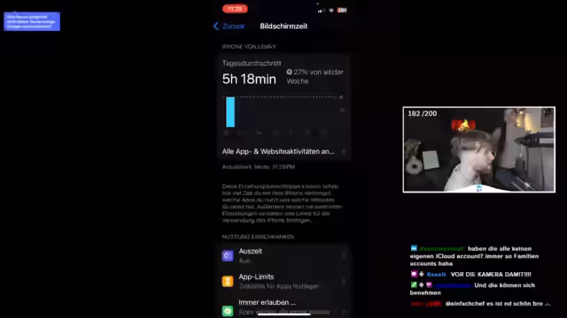 00:56:35Ein 15-jähriger Teilnehmer präsentiert sein Samsung-Handy. Die Überprüfung der Bildschirmzeit zeigt hohe Nutzungszeiten auf TikTok und YouTube, aber keine auffälligen Suchanfragen. Der Verlauf in Safari, Instagram und anderen Apps ist 'sauber' und unauffällig. Der Streamer ist beeindruckt von der mangelnden Problematik und wundert sich über die hohe Aktivität auf Reddit, wobei der Teilnehmer viele verschiedene Server abonniert hat.