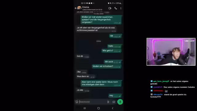 01:31:48Bei der Kontaktaufnahme mit der Frau über Instagram kommt es zu einem Problem. Der junge Mann gibt an, nicht zu Hause zu sein, da er sein Handy laden muss und daher am PC seiner Mutter schreibt. Als die Frau fragt, wer das ist, muss er eine Ausrede erfinden. Da der Name 'Ben' bei der Frau negativ besetzt ist, wird ein anderer Name, 'Alex', als Freund vorgeschlagen. Der ganze Vorgang wirkt künstlich und die Streamerin zweifelt an der Glaubwürdigkeit der Situation.