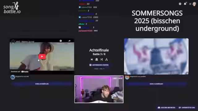 02:54:00Das Song-Battle-Turnier wird fortgesetzt, jedoch werden die Regeln präzisiert. Nur Songs aus dem Jahr 2025 sind zulässig, um das Level zu halten. Ein Teilnehmer namens Beatz erhält Modrechte, um die Einreichungen zu kontrollieren. Das Turnier wird mit 32 Teilnehmern fortgesetzt, während die restlichen Zuschauer auf Aufforderung Werbung schauen oder eine Runde Kopf oder Zahl spielen.