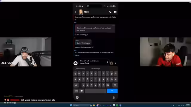 00:28:08Nachdem die Interaktion mit Simon und Nora geendet hat, gerät der Streamer in eine hitzige Debatte mit seinem Co-Moderator Alex. Es geht um die Wirksamkeit von Alex' Avancen. Während Alex der Meinung ist, "Game" zu haben, kritisiert der Streamer dessen Methoden scharf und wirft ihm vor, mit seinen "behinderten" Nachrichten bei Frauen wenig Chancen zu haben. Die Debatte eskaliert leicht, bis der Streamer Alex als "Vollidiot" bezeichnet, was den Fokus auf ihre unterschiedlichen Herangehensweisen lenkt.