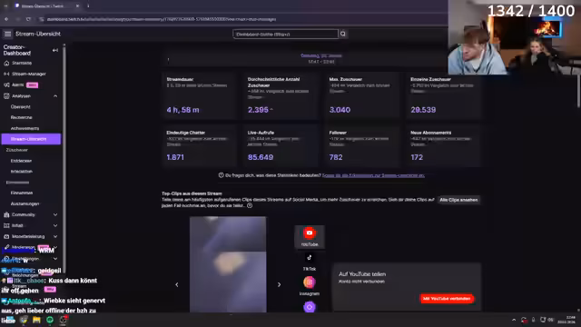 04:37:02Die Streamerin beschließt, einen TikTok-Vlog über den vergangenen Tag mit Shanti zu erstellen. Sie plant ein Voice-Over für ein Video, das romantische Momente, Einkäufe und gemeinsame Aktivitäten zeigt. Es kommt dabei zu technischen Schwierigkeiten beim Hochladen, aber der Vlog wird als "insane" beschrieben. Gleichzeitig im Chat kommt es zu einem Disput über einen Disstrack gegen den Streamer Theo, der als zu leicht angesehen wird.
