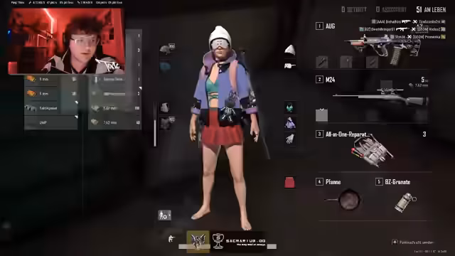 05:47:57Es findet eine detaillierte Diskussion über das Sammeln und Verwalten von Ausrüstung in PlayerUnknown's Battlegrounds statt. Streamer tauschen sich über Loot-Strategien aus, wie zum Beispiel das Finden von Visieren und Waffen, und den besten Weg, um sich für ein Matchup auszurüsten. Es wird über den Wert verschiedener Waffen wie die MK12 und N24 diskutiert und wie deren Ausrüstung die Überlebens- und Siegchancen in einem Spiel erhöht.