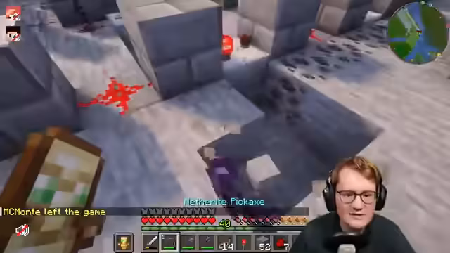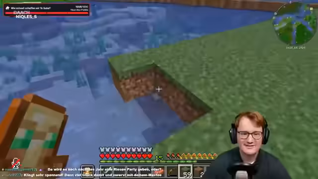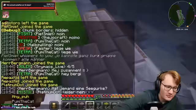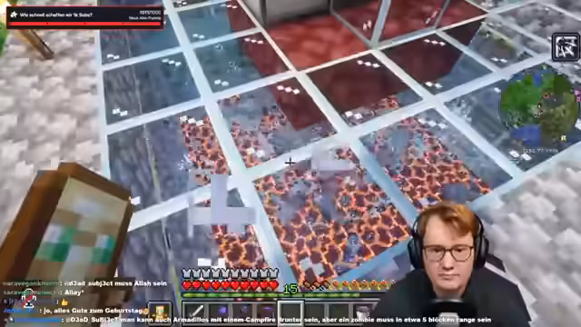 02:49:31Der Stream beginnt mit der Planung und dem Bau eines Bereichs für das geplante Minigame. Es wird systematisch mit Fackeln ausgeluchtet, um das Spawnen von Mobs zu verhindern, bevor der Bereich später mit einer TNT-Maschine gesprengt wird. Gleichzeitig wird die Beschaffung von Wolle von einem Mitspieler namens Eli für den Bau der Spielfläche besprochen und angefordert. Als wichtiges Werkzeug für das anstehende Projekt wird auch der Bedarf an Hooks und Strings für die Konstruktion erwähnt.