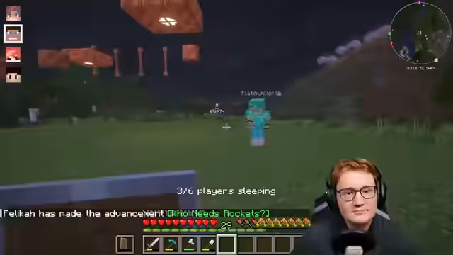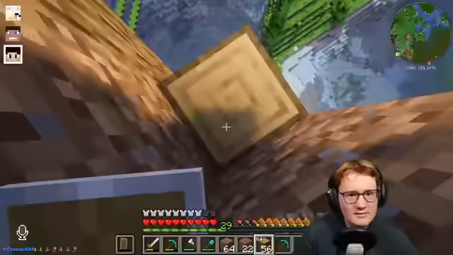 08:08:19Der Streamer plant eine Teleportation zur Stasis Chamber im Freizeitpark. Er nutzt Enderperlen und einen Schnipsel-Effekt für die Bewegung und landet in einer Lush Cave, wo er reichlich Ton organisiert, der für den bevorstehenden Bau des Freefall-Towers benötigt wird. Parallel dazu wird das Erreichen von Efficiency 5 an einem Villager gefeiert, da der Fokus nun auf dem Erlangen von Unbreaking 3 und dem weiteren Abbau liegt, um den Berg freizulegen und weiteres Baumaterial zu beschaffen.