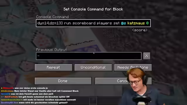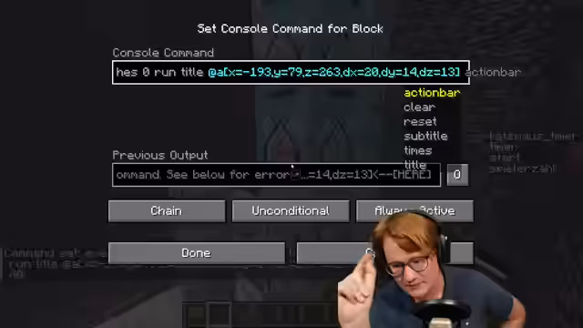 01:41:38Es wird festgestellt, dass das Spiel nicht neu startet und der Timer nicht läuft. Das Problem wird behoben, indem die Reihenfolge der Command-Blöcke angepasst wird. Der Start-Timer wird standardmäßig auf 6 gesetzt, um das Problem zu beheben, dass der Timer bei 6 beginnt. Es werden unterschiedliche Titel für Katze und Maus erstellt, die per Subtitle angezeigt werden. Für alle Spieler wird der Titel 'Es geht los' angezeigt. Für die Maus wird der Subtitle 'Laufe vor der Katze weg' und für die Katze 'Fang alle Mäuse' angezeigt. Es wird getestet, ob die Titel korrekt angezeigt werden. Der Streamer bittet Janus um einen Test des Spiels.