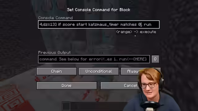 01:31:52Es werden mehrere Befehle ausgeführt, um den Spielern den Start des Spiels anzukündigen. Ein Soundeffekt wird abgespielt und ein Titel mit dem Countdown wird angezeigt. Der Timer wird heruntergezählt. Es wird getestet, ob der Timer korrekt funktioniert und sich beim Verlassen des Spiels zurücksetzt. Ein Fehler wird behoben, der verhinderte, dass der Sound abgespielt wurde. Der Timer wird so angepasst, dass er sich nur zurücksetzt, wenn weniger als zwei Spieler im Spiel sind. Es wird die Spielstartlogik implementiert, die ausgeführt wird, wenn der Timer auf 0 steht. Der Timer wird auf -1 gesetzt, um ein wiederholtes Starten des Spiels zu verhindern. Beim Spielstart wird ein Titel für alle Spieler angezeigt. Eine zufällige Person im Hausbereich wird als Katze ausgewählt und erhält den Score 2. Es wird festgestellt, dass der Timer auf der 1 startet, was korrigiert werden muss. Die Reihenfolge der Command-Blöcke wird angepasst, um sicherzustellen, dass sie in der richtigen Reihenfolge ausgeführt werden.