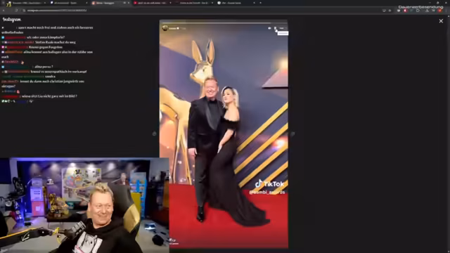 00:55:07Der Streamer schaut sich Bilder vom Bambi an und entdeckt, dass er und seine Partnerin in einer Online-Galerie der 'schönsten Paare auf dem roten Teppich' aufgeführt sind. Er ist überrascht und erfreut, sich neben Prominenten wie Heidi Klum und Giovanni Zarrella zu sehen. Er erzählt von seinen Begegnungen auf dem Event, darunter ein Gespräch mit dem 'Bergdoktor' über seinen Bandscheibenvorfall, bei dem er erst später realisierte, dass es sich um einen Schauspieler handelte. Er traf auch Stefan Halaschka, seinen Hotelzimmernachbarn, der versehentlich an seine Tür klopfte. Eine lustige Anekdote ist, wie seine Partnerin ihn um halb zwei Uhr nachts überredete, nach Hause zu fahren, anstatt im Hotel zu übernachten, worüber er am nächsten Morgen froh war. Er freut sich über die Platzierung in der Liste der schönsten Paare und scherzt, dass sie vielleicht auch nur die einzigen zehn Paare waren, die dort abgebildet wurden.