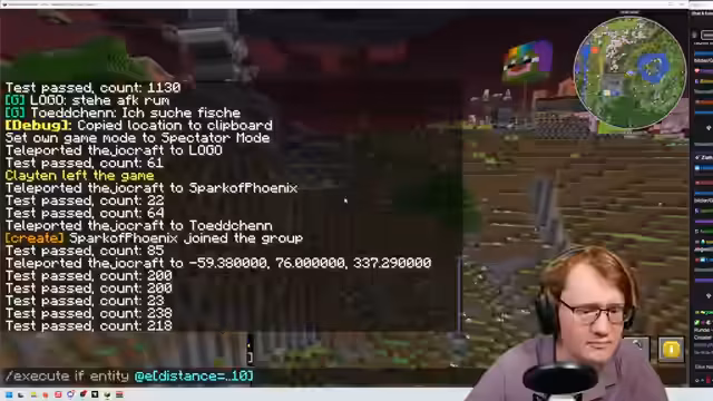 06:21:42Nach dem erfolgreichen Test mit gefärbtem Wasser wird der finale Versuch mit echter Lava unternommen. Das Timing der Animation wird so eingestellt, dass das Huhn gerade rechtzeitig aus der Lava-Kammer zurückgezogen wird. Gleichzeitig wird die Musik-Steuerung implementiert. Sobald das Huhn durch die Lava getötet wird, wird ein Item gedroppt, das über einen Komparator eine Notenblockmaschine aktiviert, die den zugehörigen Song abspielt. Ein Timeout-Mechanismus verhindert, dass die Musik zu oft hintereinander abgespielt wird.