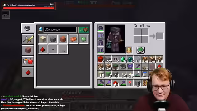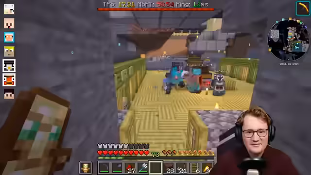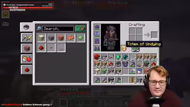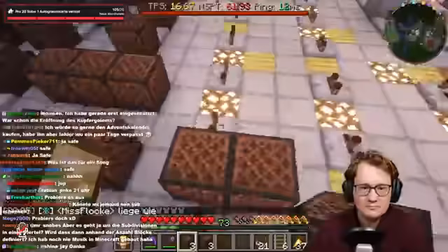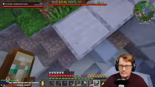 00:42:48Der Streamer freut sich auf das Kupfer-Golem-Lager, das in Zukunft alle gesammelten Gegenstände sortieren soll. Für den Bau der Musikanlage werden Glowstone-Notenblöcke, Glas, Sand, Dirt und Holz benötigt. Es wird festgestellt, dass die Anlage im Keller, insbesondere die Stick-Produktion, sehr effizient läuft. Die Suche nach einem Redstone-Villager, der Glowstone handeln kann, erweist sich als schwierig, da der Villager nicht an seinem gewohnten Platz ist. Pumi bietet an, Glowstone aus dem Lager zu holen, was die Materialbeschaffung erheblich erleichtert. Es werden 11 Stacks Glowstone benötigt, wovon 4-5 Stacks als Bezahlung für Pumi dienen.