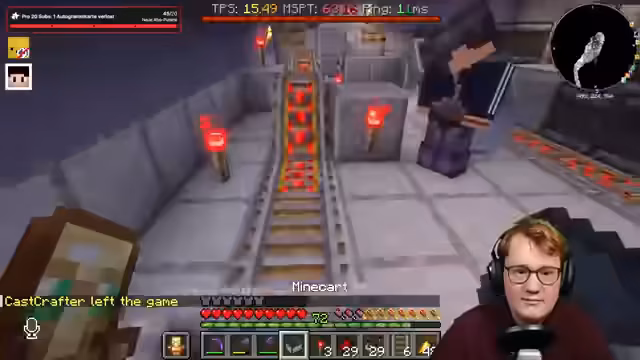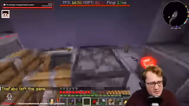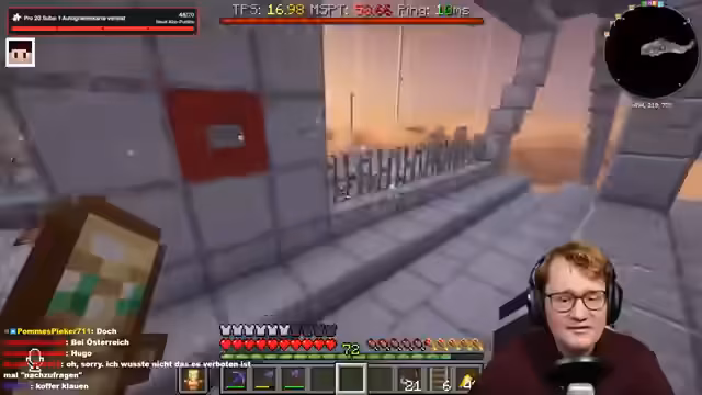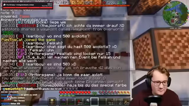02:46:47Es treten kurzzeitig Server-Lags auf, die möglicherweise die Funktionalität der Gondelbahn beeinträchtigen. Es wird überlegt, alternative Mechanismen wie Wasser für die Minecarts zu verwenden, um die Zuverlässigkeit zu erhöhen. Der Besucher erreicht den Freizeitpark erfolgreich und ist beeindruckt von der Anlage. Es wird eine extrem effiziente Stein-Farm gezeigt, die sich automatisch mit Ressourcen auffüllt, und der Besucher darf sich daran bedienen. Die Trading Hall ist noch im Bau, aber die Farmen sind bereits voll funktionsfähig und werden durch Junkloader am Laufen gehalten. Die automatische Synchronisierung der Minecarts wird als ein Beispiel für die durchdachte und langlebige Technik des Streamers hervorgehoben.
