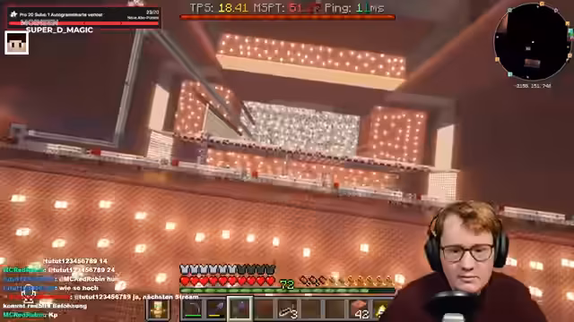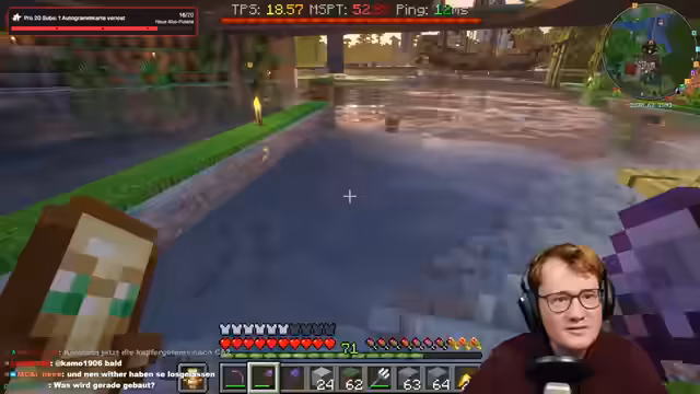 03:06:02Der Streamer arbeitet an der musikalischen Untermalung des Freizeitparks und baut Notenblock-Songs. Ein neuer Song wird vorgestellt, dessen Melodie die Zuschauer erraten sollen. Die Notenblöcke müssen noch gestimmt werden, um den gewünschten Klang zu erzielen. Währenddessen wird eine kurze YouTube-Aufnahme vorbereitet, bei der die Zuschauer im Chat mit "I.I.Captain" begrüßen sollen. Es wird betont, dass der Server trotz der vielen komplexen Redstone-Konstruktionen effizient läuft und die Lags eher durch andere Faktoren verursacht werden. Der Streamer gibt einen Shoutout an PumiTheCat für das beeindruckende Design des Piratenschiffs und erwähnt, dass der Server bald 500.000 Abonnenten erreichen wird. Es wird auch ein funktionierendes Dosenwerfen-Minigame gezeigt, das Skill erfordert und Teil des Piraten-Themengebiets ist.
