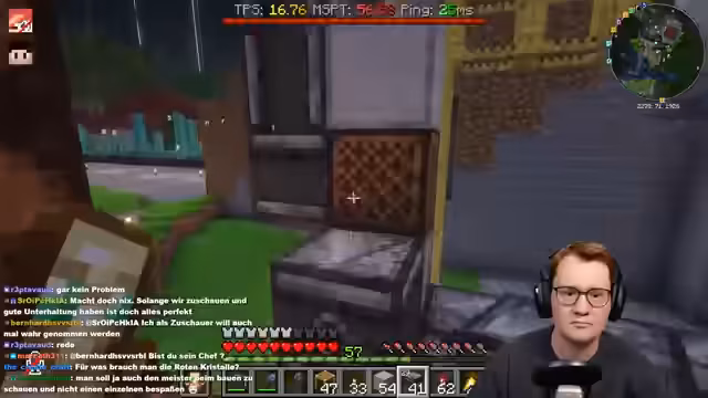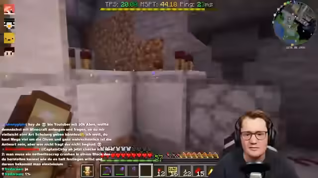 00:00:05Der Stream beginnt mit der Begrüßung der Zuschauer. Es werden technische Schwierigkeiten mit den Chunk-Loadern im Nether thematisiert, die dazu führen, dass Items verschwinden. Der Streamer bemerkt zudem, dass sein Ping und das gesamte Internet instabil sind, was ihm die Arbeit erschwert. Als Lösung wird der Bau einer einfachen Bambusfarm mit Mud in Erwägung gezogen, um die Chunk-Loader zuverlässiger zu füllen und Itemverluste zu verhindern.