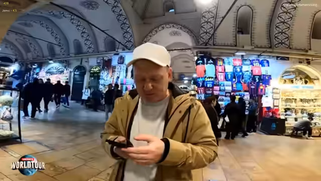 05:28:38Während der Suche nach dem Eingang zum Großen Basar werden sie von Einheimischen angesprochen, die ihnen Waren anbieten. Der Streamer handelt mit einem Verkäufer über den Preis von Retro-Trikoten. Er erwähnt, dass er sich hat abzocken lassen, aber der Spaß im Vordergrund stehe. Die Atmosphäre ist dabei sehr lebhaft und der Streamer interagiert ständig mit den Passanten und dem Chat.