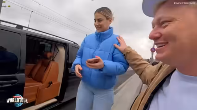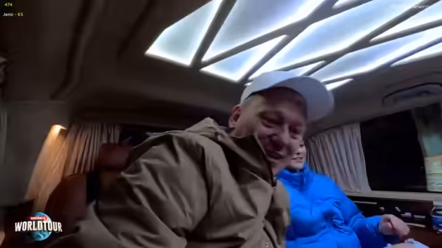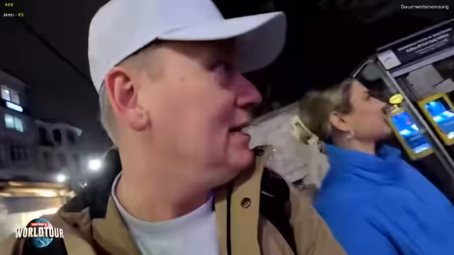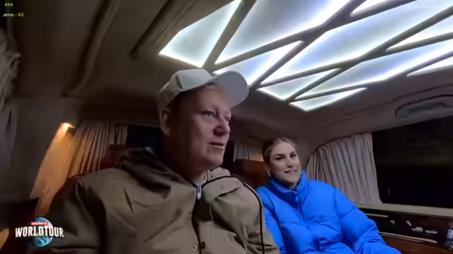 00:37:40Am Treffpunkt warten bereits der Fahrer Achmed und sein Auto, welches der Streamer als 'Kriegsschiff' bezeichnet. Er stellt Ahmed seiner Frau als süßen und englischsprachigen Fahrer vor, der perfekt mit der Welttour klarkommt. Die erste Station ist einstweilen nicht der Basar, sondern die Besichtigung eines Fischers an der Galata-Brücke, wo der Streamer interaktiv mit den Fischern und dem Chat interagiert.