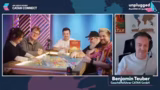 05:27:11Das Spiel endet, nachdem eine Spielerin, Gina, als Erste die 10-Punkte-Marke erreicht hat. Nach der Partie schaltet sich Benni Teuber, der Entwickler von 'Catan Connect', zu. Er lobt das intensive Spiel und den schnellen Spielverlauf, der sich auf circa 30-40 Minuten beläuft. Laut Teuber ist der Zeitdruck der USP der Version, der für eine hohe Konzentration sorge und das Spiel für Kenner wie Neulinge gleichermaßen spannend mache. Das Fazit ist eine positive Bewertung des innovativen Spielkonzepts.