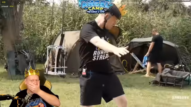 02:12:41Plötzlich Geräusche aus dem Wald lassen Streamer und Co-Moderator Sascha eine Konfrontation mit einer externen Gruppe, das sogenannte 'Querwich Project', befürchten. Ein Geschrei und die Androhung mit einem Messer lösen Panik aus. Eine Sicherheitsbegleitung wird für Sascha angefordert, der sich auf einen gefährlichen Bereich des Geländes begeben hat. Der Vorfall erzeugt eine angespannte Atmosphäre, wird aber mit dem Einsatz von Bodyguards und der Aufforderung zur Ruhe letztendlich gebündelt. Der unbeschwerte Charakter des Camps tritt in den Hintergrund.