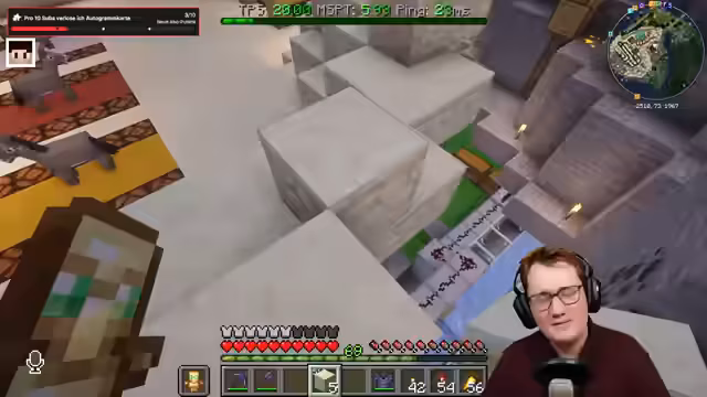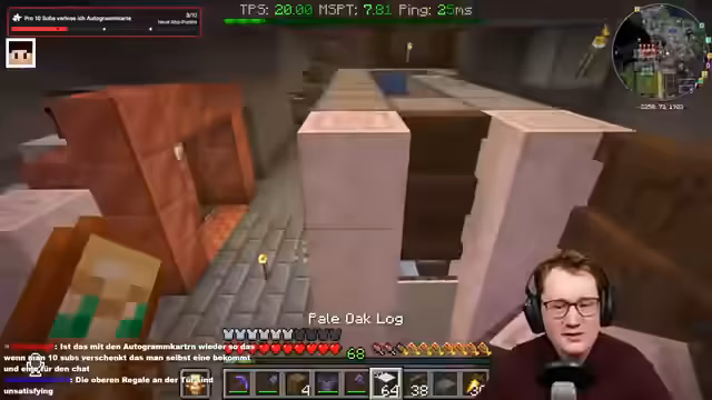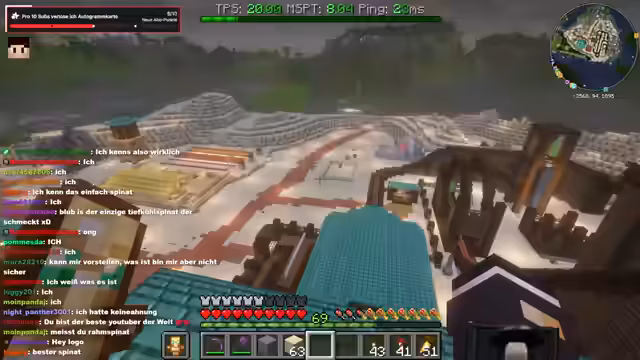00:03:29Der Streamer begrüßt die Zuschauer zum Craft-Attack-Sonntag und meldet zunächst technische Schwierigkeiten, insbesondere eine geringe Anzahl an Chunks auf dem Server, die zu erheblichem Lag und nur einem Frame pro Sekunde führen. Gleichzeitig kündigt er eine Verlosung von Autogrammkarten für jede zehnte Subscription an und erwähnt, dass Craft Attack das Gameplay erleuchte.