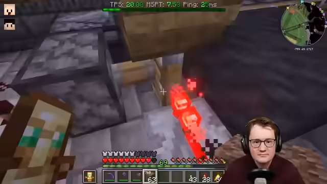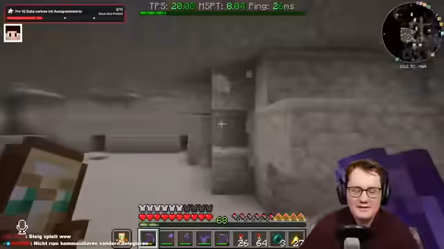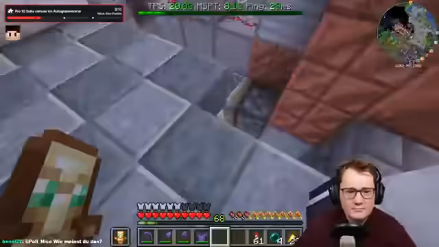 00:07:47Nach anfänglichem Lag und schlechter Performance stellt der Streamer fest, dass das Problem nicht an seinem PC, sondern am Server selbst liegt. Er identifiziert die Ursache als hohe Entity-Anzahl in der Umgebung, die von den Chunk-Loadern geladen wurde. Nach dem Neustart dieser Loaders normalisiert sich die Performance, und das Gebäude wird wieder grün angezeigt, was den erfolgreichen Betrieb der Technik beweist.
