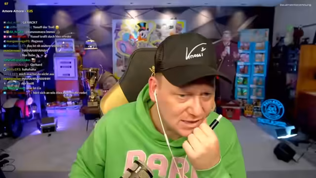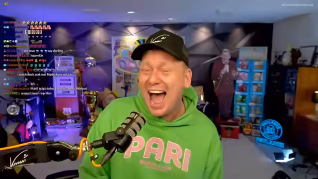 00:37:52Der Stream nimmt eine unerwartete Wendung, als ein Song von Gerhard Müller, "Amore Amore am Lago Maggiore", im abgespielten Material erscheint. Der Streamer ist zunächst baff und stellt Fragen wie "Was ist denn das?" und "Wer ist denn das?", da er den Sänger nicht kennt. Er findet den Song unterhaltsam und schlägt vor, den Künstler, wenn er ihn findet, in den Stream einzuladen. Der Höhepunkt ist ein weiterer, sehr ungewöhnlicher Song von Gerhard Müller, "Kristallenergie", der im Chat als favorisiert angesehen wird. Der Streamer ist überfordert und fasziniert zugleich von der Person Gerhard Müller, über die er wenig weiß. Er versucht erfolglos, den Musiker anzurufen und kommentiert absurde Songwünsche im Chat, wie die "Waffe in der Hand" aus einem anderen Video. Die Reaktion der Community und die authentische Verwirrung des Streamers machen dieses Segment besonders intensiv und unterhaltsam.