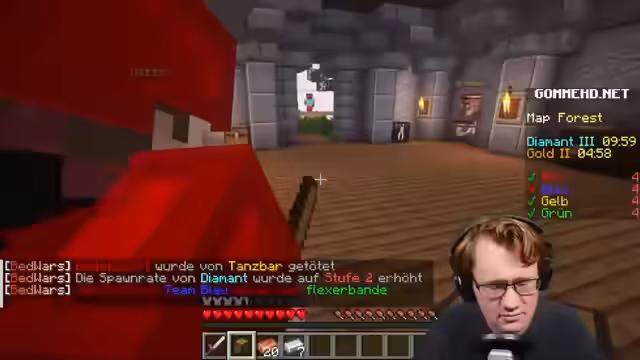 01:57:38Nachdem die private Runde voll war und alle Spieler angenommen hatten, startete der Streamer einen privaten Server. Die Spieler wählten das Team Rot und klärten wichtige Regeln: Stream-Sniping, also das taktische Ausnutzen des Streams, war untersagt. Stattdessen wurde fairer Gameplay aller Teams gleichzeitig angestrebt. Die Strategie konzentrierte sich auf das schnelle Sammeln von Rohstoffen wie Diamanten und Gold sowie den Aufbau von Verteidigungsanlagen um das eigene Bett.