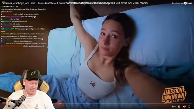 01:05:00In der ersten Nacht des Streams erleben die Teilnehmer die ersten großen körperlichen Herausforderungen. Er berichtet von starken Übelkeitssymptomen und einem Gefühl der Verzweiflung, da das Boot im Dunkeln auf dem Atlantik schaukelt. Er entwickelt einen 1-10-Skalencode für Übelkeit, wobei 10 bedeutet, dass man übergeben muss. Viele Teilnehmer, auch er selbst, erleben schwere Seekrankheitsanfälle und müssen lernen, in bestimmten Positionen auf dem Boot zu liegen, um Erleichterung zu finden.