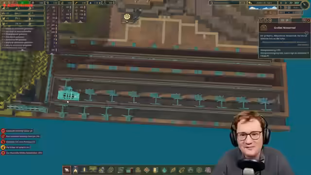 00:43:02Nachdem eine gigantische Fläche freigesprengt wurde, kann das eigentliche Hauptprojekt beginnen: der Bau des Wasserkraftwerks mit 60 geplanten Rädern. Der Streamer muss ein komplexes, kompaktes Design für die Anordnung der Wasserräder entwickeln, um den begrenzten Platz optimal zu nutzen. Parallel dazu wird die Logistik für die Anlieferung von Ressourcen wie Sprengstoff und Holz optimiert.