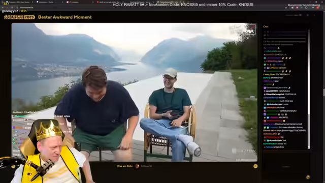 02:49:01Den Sieg in der Kategorie 'Bester Akkord-Moment' erhält der Clip mit dem unangenehmen Restaurant-Interview. Der Streamer erklärt, dass dieser Moment besonders massiv unangenehm sei, insbesondere wegen der langen, hoffnungslosen Pausen während des Gesprächs. Der Gewinner, Adam, wird ausgezeichnet und der Streamer kündigt spontan eine 'World Tour' an, bei der er Adam zu verschiedenen Locations, darunter Neuseeland, einlädt, um den Sieg zu feiern.