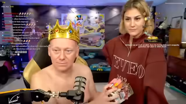 00:12:28Der Stream beginnt mit herzlichen Willkommen-Botschaften, aber der Streamer stößt auf ein Problem: Er ist oberkörperfrei und zweifelt an der Angemessenheit. Eine Umfrage im Chat soll entscheiden, ob er sich anziehen oder nicht. Nach anfänglichem Zögern und Hin und Her entscheidet er sich, sich anzuziehen. Er beschreibt das Gefühl, wieder live zu sein, als erfüllten Traum und ermutigt die Zuschauer, selbst zu streamen, um dieses Gefühl zu erleben.