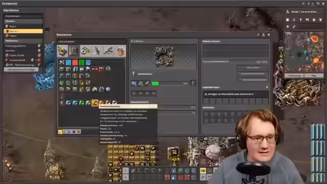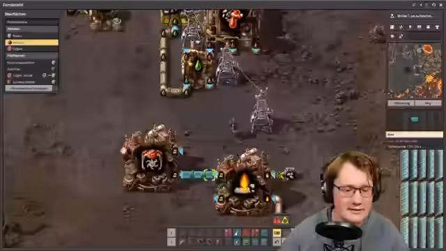 00:06:55Factorio wird als ein unfassbar geiles Spiel der Automatisierung beschrieben. Das Ziel ist es, von dem Planeten Vulkanos aus dem Universum zu entkommen. Um dieses Ziel zu erreichen, müssen verschiedene Ressourcen beschafft und Aufgaben erledigt werden. Der Spieler befindet sich auf dem Planeten Vulkanos, einem Lavaplaneten mit einer Weltraumlandestation und einem Roboternetzwerk. Roboter, sogenannte Bozzis, bauen Dinge für den Spieler. Items kommen von der Erde mit Raumschiffen, die Raketen beliefern. Die Raketen fliegen zur Raumstation und beliefern diese mit Items. Sobald die Raumstation ausreichend versorgt ist, fliegt sie von Norvis nach Vulkanus. Während des Fluges muss die Raumstation Meteoriden abwehren, aus denen Eisen, Wasserstoff und Kohlenstoff gewonnen werden. Diese Ressourcen werden für Energieerzeugung, Antrieb und Munitionsherstellung genutzt. Das Raumschiff ist ein geschlossenes, autonomes System.