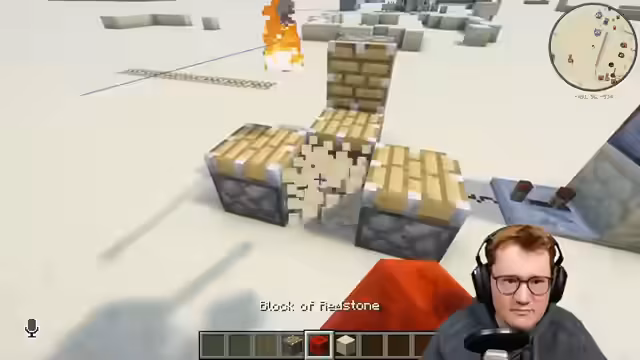 01:14:10Der Streamer beginnt mit der praktischen Umsetzung der Zündschnur im Server. Dazu werden Dispenser mit Flint & Steel platziert und an eine Redstone-Schaltung angeschlossen. Es wird darüber gesprochen, wie die Flammen automatisch gelöscht werden können – entweder durch natürliches Erlöschen oder via Wasser-Flying Machine. Ein Design für eine umkehrbare Flying Machine wird gezeigt und getestet. Gleichzeitig werden Vorbereitungen für den Bau eines großen TNT-Modells als Teil der Attraktion getroffen, wobei Ressourcen wie Slime-Blöcke organisiert werden.