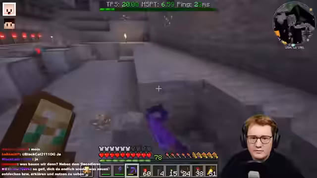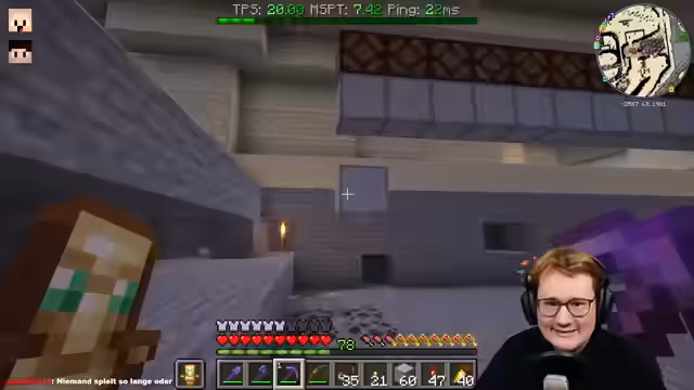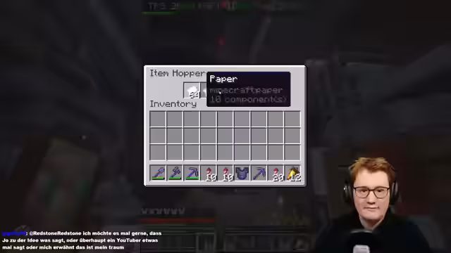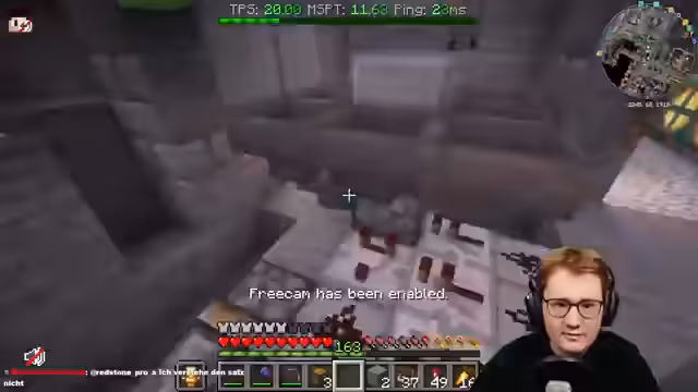 01:15:28Der Kupfergolem wird als neuer Mitarbeiter eingeführt und nach einer Umfrage "Heiko" getauft. Seine erste Aufgabe ist das Sortieren von Diamanten in vorgegebene Kisten. Heiko zeigt jedoch Desorientierung: Er verweigert das Ablegen der Diamanten, sucht fälschlich leere Kisten auf und bleibt apathisch stehen. Der Chat spekuliert über Bugs im Pathfinding-Algorithmus. Trotz Geduld und Anleitung durch den Streamer benötigt Heiko mehrere Versuche, bis er die korrekte Kiste findet – ein Hinweis auf fehlerhaftes Verhalten der Golems im Spiel.