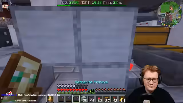 04:08:50Kupfergolems zeigen im Stream erhebliche Leistungsmängel: Sie sind langsam, überspringen Kisten und arbeiten ineffizient, was die Materialgewinnung behindert. Besonders kritisch ist der Mangel an Wolle für Banner, die zur Beschriftung der Targets benötigt werden. Es werden Banner mit den Ziffern 0 bis 9 geplant, um spätere Punkteanzeigen auf Item-Shelves zu ermöglichen. Gleichzeitig wird über ineffiziente Lager- und Farming-Probleme diskutiert, während versucht wird, genug Materialien wie Weizenblöcke und Schwarzpulver für die Bauphase zu beschaffen.