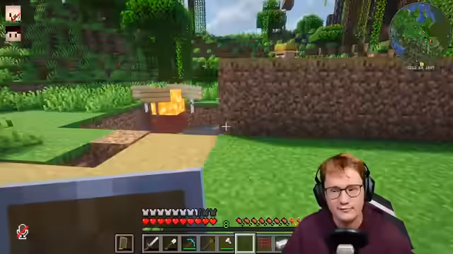 00:31:45Der Fokus verschiebt sich auf den Bau eines Villager Breeders, um die Bevölkerung des Dorfes zu erhöhen und damit die Grundlage für eine Eisenfarm und spätere Trading Halls zu schaffen. Der Streamer beschreibt den Aufbau mit einem anbauenden Feld, einem Komposter und Betten. Die Villager werden per Boot an Leinen zum Bauplatz gezogen.