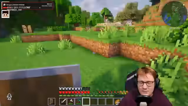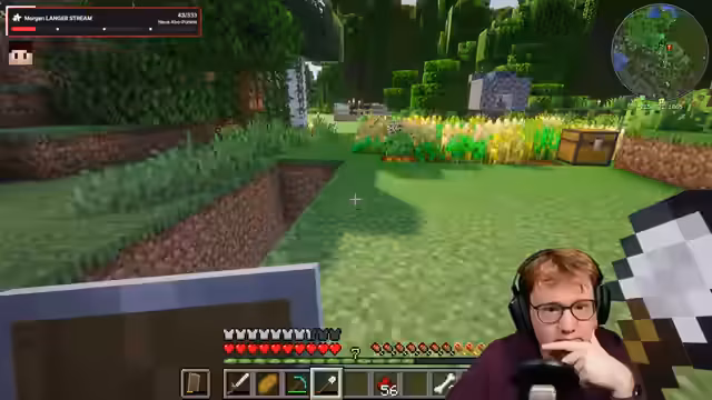 00:49:17Der Bau des Villager Breeders beginnt mit dem Ausheben des 9x9 Feldes und dem Platzieren des Wassers. Der Streamer erklärt den Mechanismus, bei dem ein Komposter-Villager das Feld bestellt und die Villager sich fortpflanzen. Parallel dazu wird der Bau eines Freizeitparks als langfristiges Hauptziel erwähnt, für den massiv Eisen benötigt wird, um Attraktionen wie Geisterbahnen zu bauen.