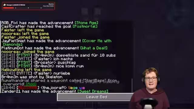 06:06:43Der Chat wird aufgefordert, kreative 'Liege wie'-Sprüche für nächtliche Streams einzureichen. Technische Aspekte wie Ressourcenpakete und Mods zur Performance-Verbesserung werden behandelt. Es gibt Probleme mit der Creeper-Farm, die nicht optimal läuft, und dem Villager-Breeder. Der Streamer testet zudem neue Skins und weist auf den 'Wuff'-Befehl für den Hund hin.