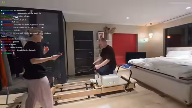00:51:54Der Streamer wird von seiner Frau zu einer Pilates-Demonstration auf dem neuen Gerät überredet, obwohl er sich noch nicht fit fühlt. Er schlüpft in die Rolle eines Sportanfängers namens Jens und versucht sich an den Übungen, während seine Frau ihn anleitet. Er beklagt sich humorvoll über die Schwierigkeit und die vermeintliche Sinnlosigkeit der Übungen, die er auch ohne das teure Gerät hätte machen können. Er kritisiert, dass solche Geräte oft überteuert sind und einfache Gymnastikübungen mit unnötigen Schnüren und Federn versehen werden. Trotz seiner Skepsis und der lustigen Fehlversuche, die das Publikum amüsieren, gibt er zu, dass das Training anstrengender ist, als es aussieht. Besonders das Halten der Positionen fordert ihn heraus. Er schließt die Demonstration mit einer Bauchmuskelübung ab und fragt das Publikum, ob das Pilates-Gerät ein passendes Geburtstagsgeschenk für seine Frau war.