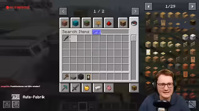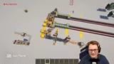 01:41:27Das Konfigurations-System wird nun in die bestehende Fabrik integriert. Die als Minecarts gespeicherten Aufträge werden in einer Warteschlange, einem Dispenser, abgelegt. Ein Redstone-Signal, das auf das Vorhandensein von Aufträgen reagiert, startet den Produktionszyklus. Der Takt der Fabrik nimmt die Konfigurations-Minecarts auf und leitet sie synchron mit dem Chassis durch die Produktionsstationen.