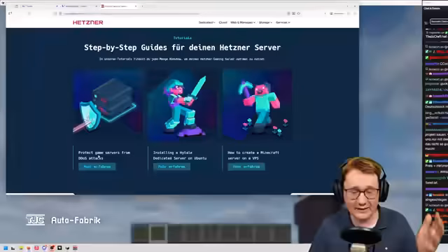 01:11:47Eine Ankündigung für eine Minecraft-Talentshow wird getätigt. Teilnehmer sollen auf einem eigenen Server kreativ werden und ihre Fähigkeiten präsentieren, wobei eine Jury die besten Leistungen bewertet. Ebenfalls wird die Partnerschaft mit dem Server-Hoster Hetzner beworben. Ein Creator-Code wird vorgestellt, der neuen Kunden 20 Euro Startguthaben sichert, um das attraktive Preis-Leistungs-Verhältnis des Unternehmens hervorzuheben.
