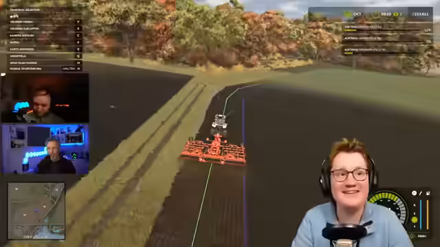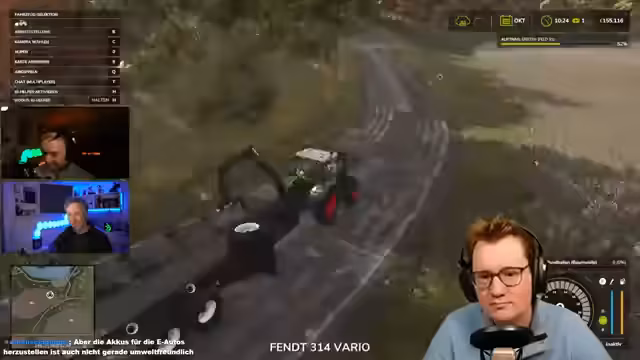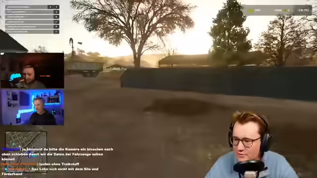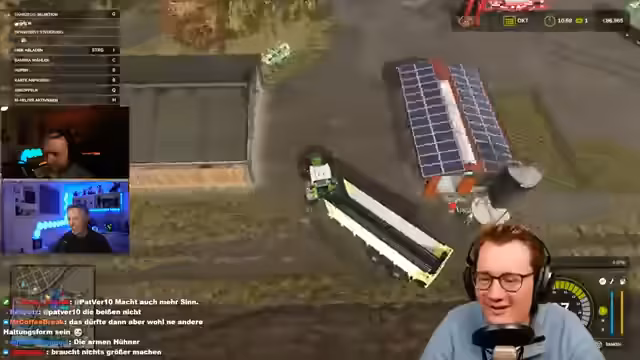 02:52:22Im Farming Simulator wird eine riesige Kartoffelerntemaschine eingesetzt. Diskutiert wird der Einfluss von Regen auf den Ertrag. Azubis im Spiel werden vorgestellt, wobei der Streamer auf den Unterschied zwischen ersten und zweiten Lehrjahr eingeht. Es gibt technische Probleme mit der Kamera eines Gastes, die zu Standbildern führen. Abschließend werden Kartoffeln transportiert und über Effizienz von Maschinen gesprochen.