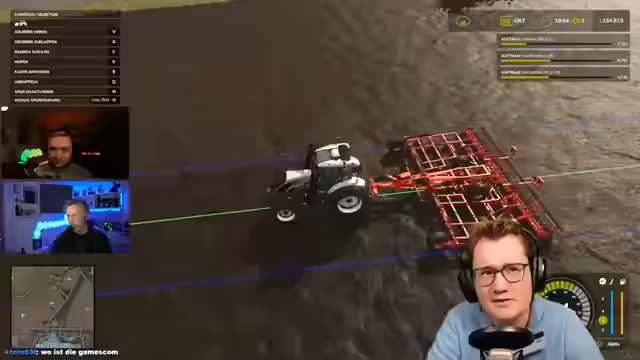 03:51:35Im Farming Simulator sind die Traktoren im Schlamm unterwegs, was zu weniger Grip auf den Feldern führt und die Fahrzeugreaktionen matschiger macht. Ein Auftrag für Gruber wurde erfolgreich abgeschlossen, was 400 Euro Mietkosten einsparte und zusätzliche Einnahmen generierte. Die Grafikeinstellungen wurden auf 'sehr hoch' angehoben, allerdings nicht maximal, um die Leistung des PCs nicht zu überlasten. Es folgten Diskussionen über Feldbearbeitung, Düngung und die Entscheidung, Soja statt Kartoffeln anzubauen, da dies mit vorhandenen Maschinen effizienter ist.