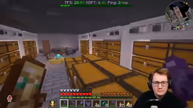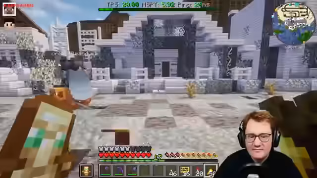00:19:02Nach dem Test des Minigames wird ein Besuch bei Kroks Projekt gestartet. Der Streamer bestaunt den innovativen Bau, der eine ungewöhnliche Blockpalette aus dem End verwendet. Ein Highlight ist der geheime Bücherkeller, der bei Betreten verdunkelt wird und mit Zombie-Bücherverkäufern interaktiv gestaltet ist, um eine Zelda-inspirierte Atmosphäre zu schaffen.