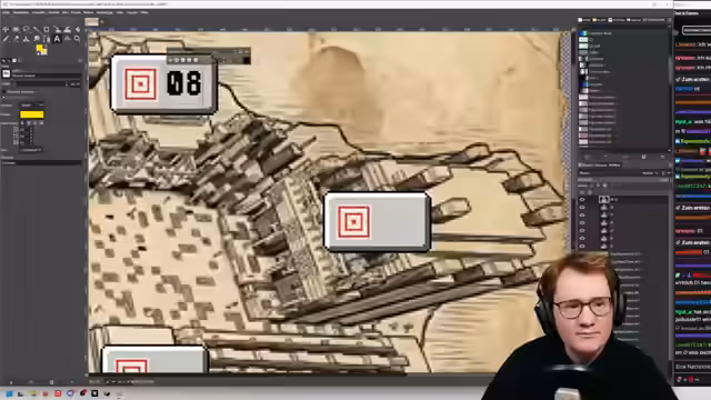 01:23:57Nach der Begutachtung mehrer von der KI erstellte Entwürfe wird ein Design als Basis ausgewählt, welches besonders durch sein zerrissenes Pergament-Layout überzeugt. Als nächster Schritt werden konkrete Spielelemente wie ein Target-Block-Ziel und ein Pfeil für den Pfad des Spielers in das Design integriert. Dabei wird auch der Startpunkt für die Karte definiert.