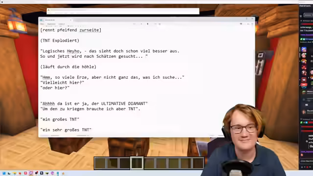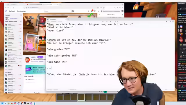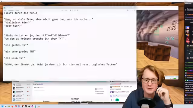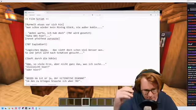 02:22:59Es wird nach einer typischen Line für Logo gesucht, um Easter Eggs einzubauen. Die Idee, etwas über 'die da oben' zu sagen, wird als passend empfunden. Es wird überlegt, wie man es formuliert. Der Chat von Logo soll helfen, Lines zu finden, die sehr typisch für ihn sind. Logo soll sagen: 'What? Ich glaube, ich bin im Singleplayer. Ich wusste es schon immer, dass die da oben was vor uns verheimlichen. Unter unseren Füßen.' Das soll manisch klingen. Es wird ein Take gemacht. Logo sagt: 'What? Ich wusste schon immer, dass die da oben was für uns verheimlichen. Na Leute, das schauen wir uns jetzt an.' Der Take war gut. Der Shift von Hochdeutsch zu Sächsisch ist etwas schwer. Logo soll noch mehr Herzensblut reinlegen. Es wird ein zweiter Take gemacht. Logo sucht einen Diamanten und es gibt die Gelegenheit, Easter Eggs einzubauen, z.B. ob hier ein Kupfergolem ist. Logo läuft durch die Höhle und sucht. Er soll auf Sächsisch reden. Der Abschnitt soll etwas länger sein. Logo überlegt, was er sagen könnte. Es wird überlegt, den Sachsen mehr durchhängen zu lassen. Der Streamer fragt, ob das hier MDR ist. Logo soll den Klunker suchen. Es wird überlegt, ob er angetrunken sein soll. Logo soll sagen: 'Ich such den großen Klunker in der Höhle, aber ich kann keine finden.' Es wird ein Take mit 'Schickimicki-Kristallen' gemacht, aber der erste Take wird als besser empfunden. Es wird zum letzten Take übergegangen. Logo entdeckt den Riesendiamanten und setzt TNT. Er soll immer etwas sagen. Zum Beispiel: 'Na, da ist er ja, der ultimative Diamant. Um den zu kriegen, brauche ich aber TNT. Ein großes TNT. Ein sehr großes TNT. Ein GIGA-TNT.' Jedes Mal, wenn er TNT sagt, steigert sich das TNT. Es wird ein letzter Take gebraucht, wo er das TNT zündet. Logo soll sagen: 'Oh, der zündet ja. Okay, dann bin ich immer raus. Auf Wiedersehen. Tschüssi.' Und dann schnell weglaufen. Logo soll übertreiben und lustige Logo-Wörter verwenden. Der Streamer schickt einen Screenshot. Logo soll sagen: 'Junge, was ist denn das für Riesenklunker? Um den abzubauen, brauche ich auch mehr als eine Spitzhacke. Da brauche ich ein großes TNT. Ein Riesen-TNT. Ein gigantisches TNT.' Es werden vier TNT benötigt. Der Anfang war geil. Es fehlt ein TNT. Logo sagt: 'Da brauche ich TNT. Ein großes TNT. Ein sehr großes TNT. Ein Gigateen.' Es wird eine Mini-Pause dazwischen gemacht. Es ist Take Nr. 4. Logo verquatscht sich und vergisst ein TNT. Er soll einfach übertreiben. Es wird eine Version mit mehr Logo-Slang gemacht. Der Take ist cool. Der Streamer modelt das nachher. Wenn es ihm nicht gefällt, ruft er Logo nochmal an. Jetzt sind sie beim Finale.